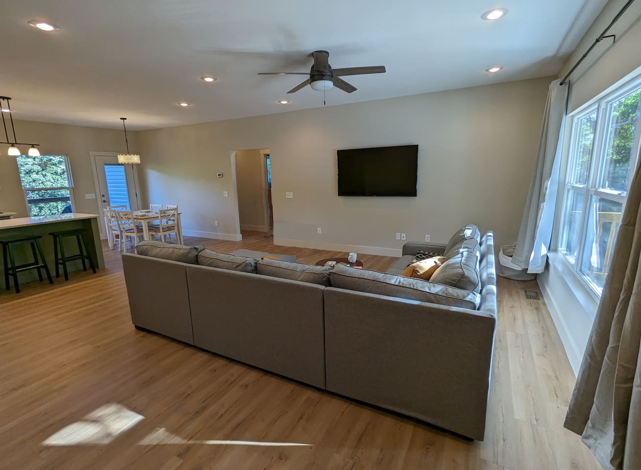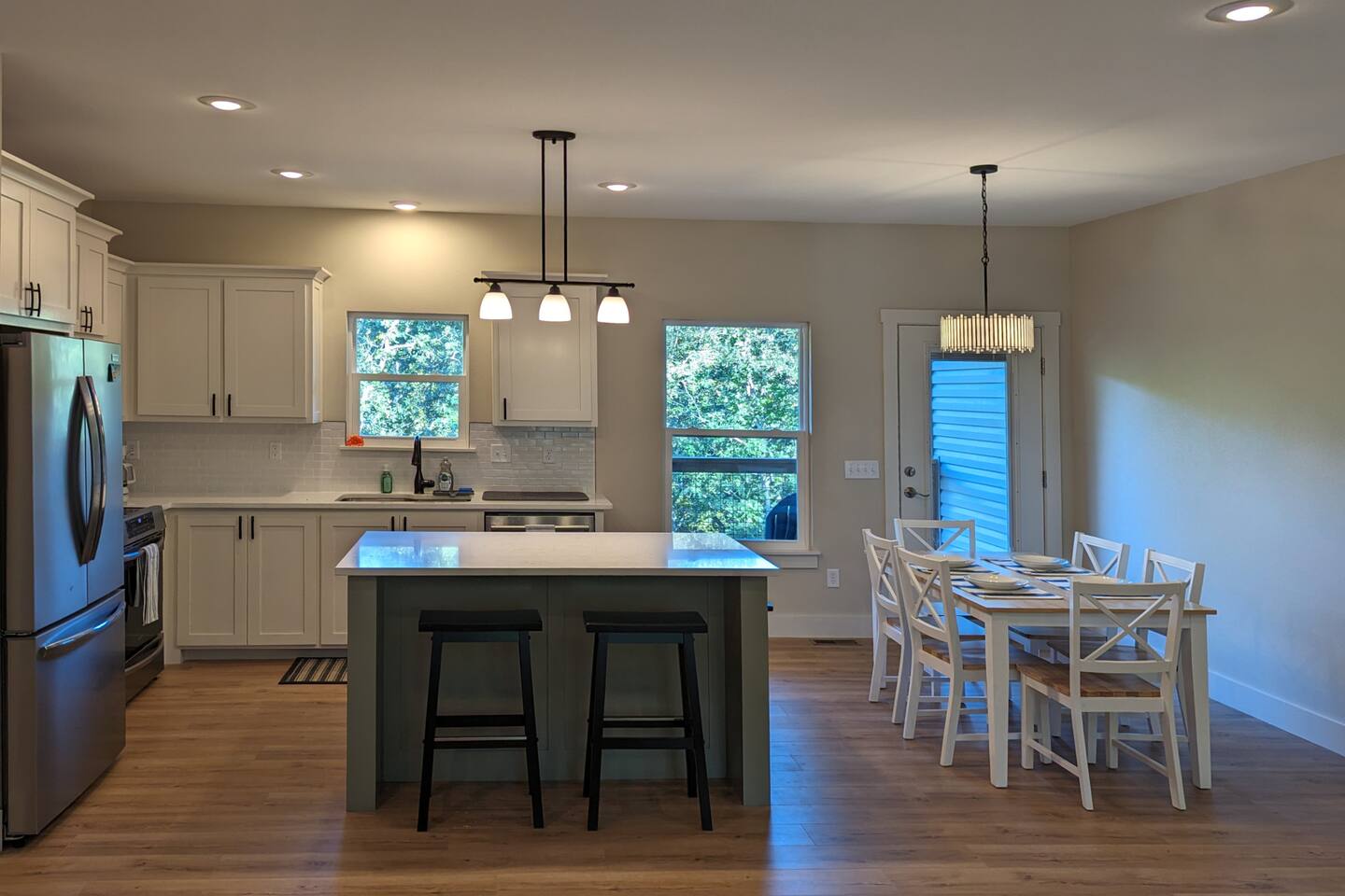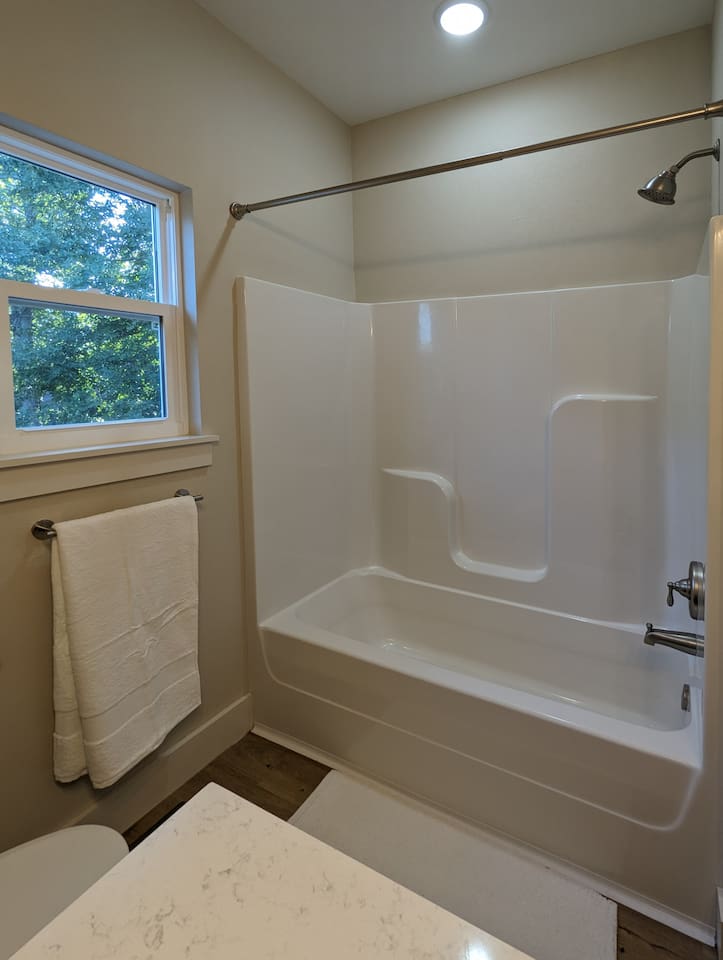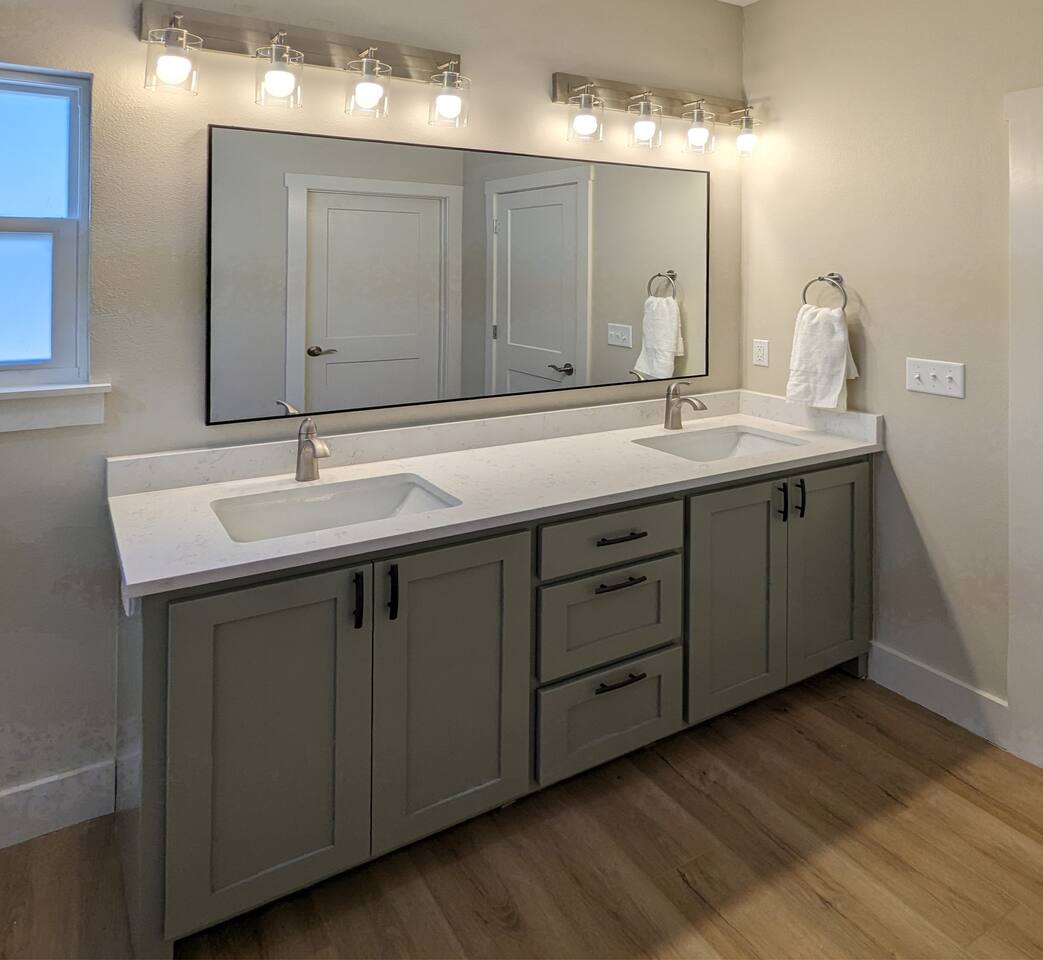 Open format 3 bedroom and 2 bathroom home with modern amenities (high speed internet, EV charger, and dedicated office space). The Blue Ozark has a single story and is great for families on vacation or small groups ready to shred the OZ trails of NWA. The main bedroom has a TV, king bed, and en suite bathroom. The second bedroom has a queen bed, and the third bedroom has two twin XL beds.