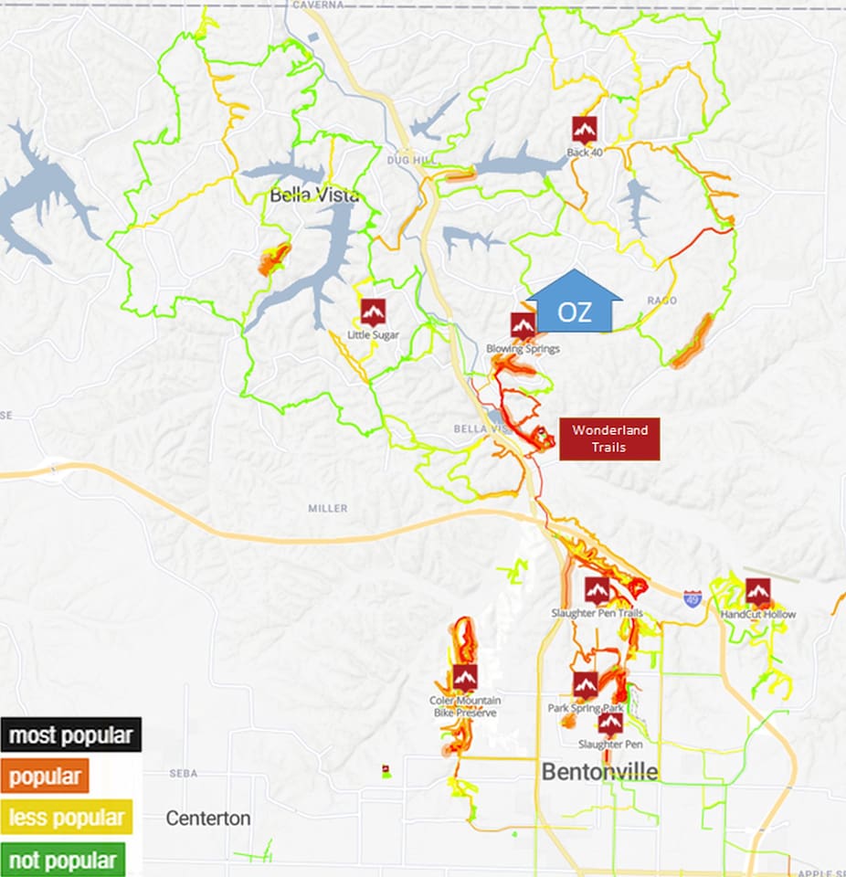 Quiet cul-de-sac located 5 mins (driving) or 15 minutes (walking) to Blowing Springs park. One minute riding to the Back 40 trail. About 10 minutes drive to downtown Bentonville, Slaughter Pen Trails, Coler Mountain Bike Preserve, Little Sugar trail network, Hand Cut Hollow trails, and more.